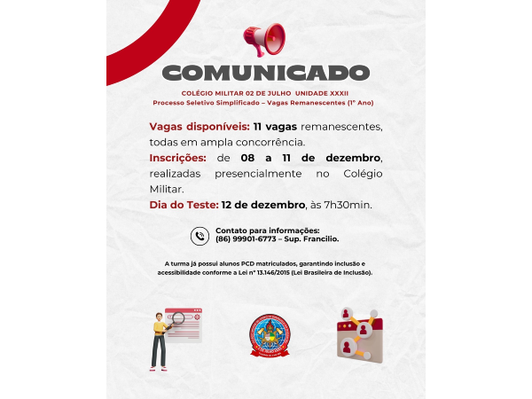 COLÉGIO MILITAR 02 DE JULHO - UNIDADE XXXII Processo Seletivo Simplificado para o Preenchimento de Vagas Remanesc [...]